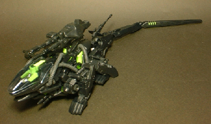 The Heldigunner kit comes on four frames, along with a wind-up motor, eight rubber caps, a frame of rubber tubes (common with the Deadborder), a clear canopy, a small dull chromed silver pilot, and label sheets. The Zoid is molded in black and neon green, with grey tubes and a clear canopy. The Zoid's motor and other green parts, as well as the labels, glow in the dark. The Zoid's body halves do not completely join at the back; a small slit allows for the tail's movement. Whether this feature was intentional in its design remains unknown but it is carried through to all subsequent versions.
