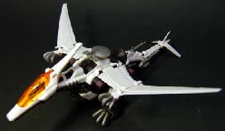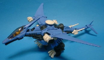 The Raynos was released as part of the Zoids (1999) line. It was light grey with teal armour and wings, black caps, silver weapons, and an orange canopy. The right wing is always raised slightly higher than the left.